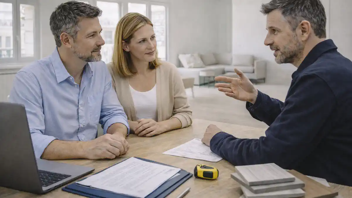 Флиппинг недвижимости в Италии: расчёт прибыли и ремонт квартиры перед продажей Современная квартира в Турине на этапе подготовки к продаже: обсуждение сметы ремонта и расчёта прибыли, нейтральная деловая атмосфера