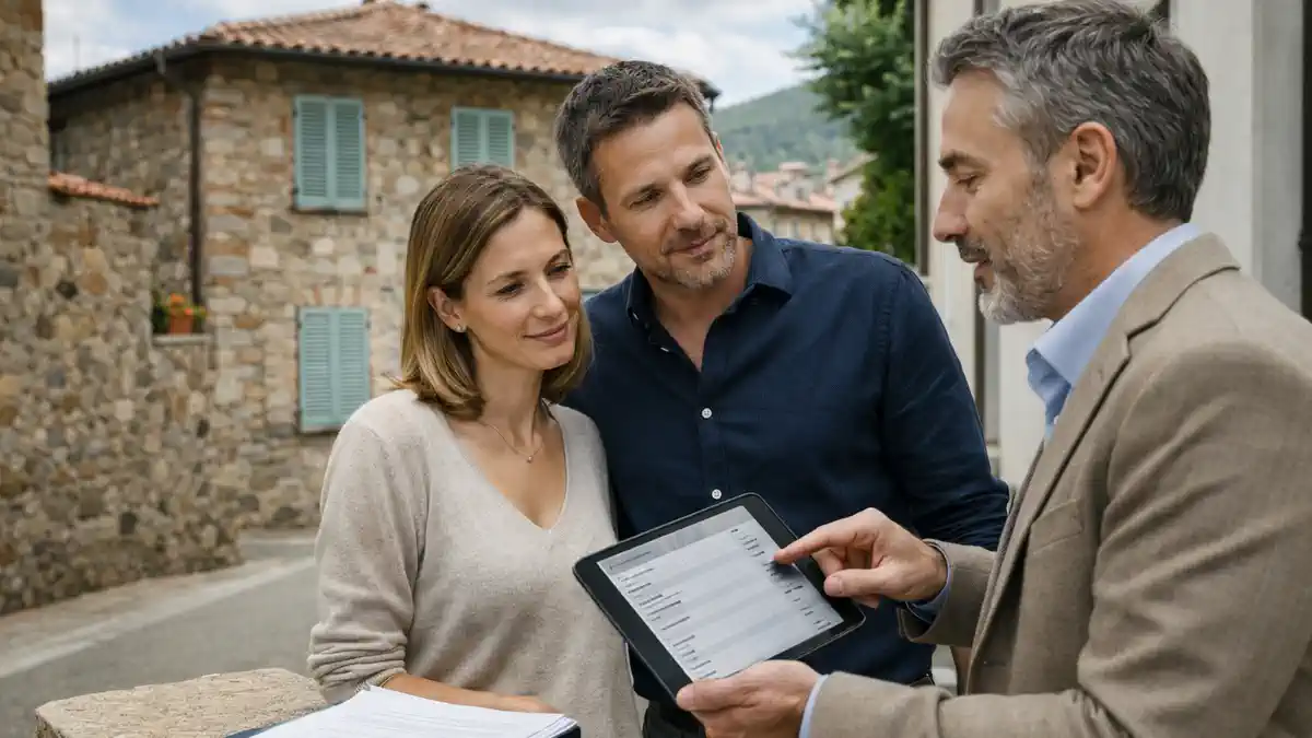 Небольшой каменный дом в итальянском борго, дневной свет. На переднем плане пара 30-45 лет с агентом 35-55 лет смотрят на план дома и список расходов на планшете без читаемого текста, рядом ключи и папка документов