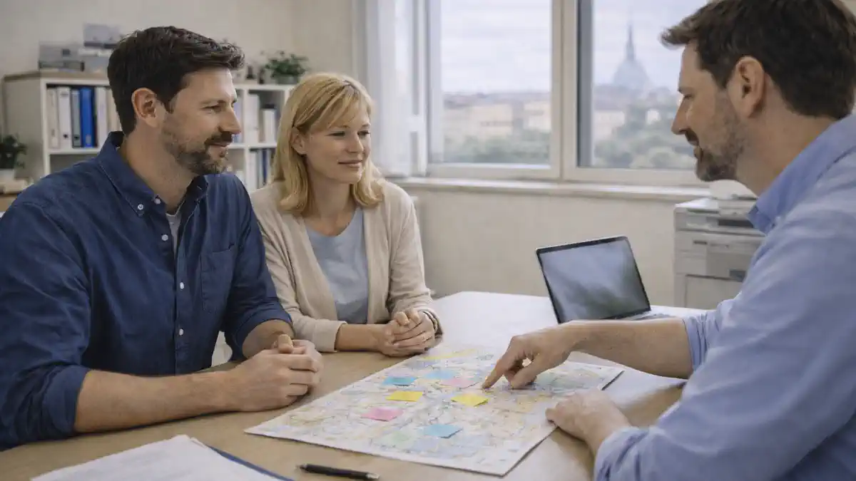 Покупка квартиры в Турине - районы и инвестиции 2025 Пара 30-45 лет с консультантом смотрят карту районов Турина и план сделки, современный офис, естественный дневной свет, без логотипов.