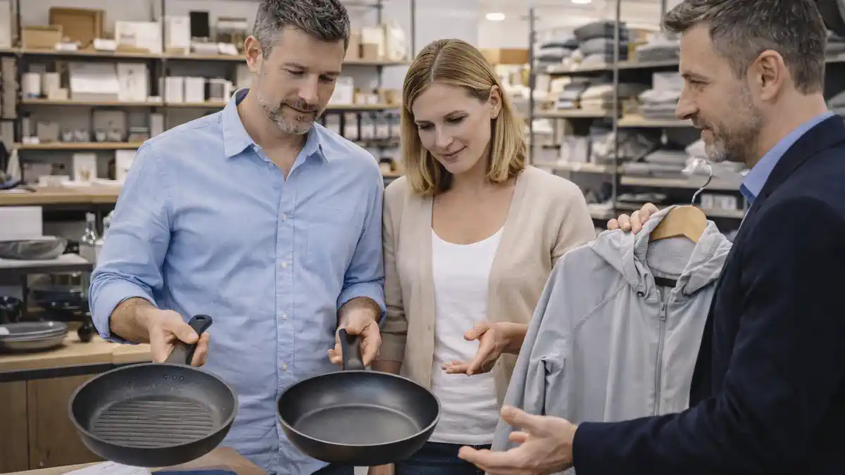 Новые запреты ЕС 2026: товары с ПФАС и выбор в Италии Покупатель в современном магазине в Италии сравнивает посуду и водоотталкивающую одежду, в руках коробка