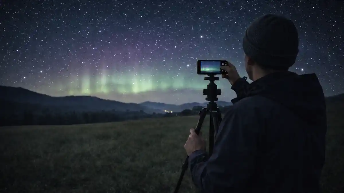 - Для наблюдения — тёмное место, чистый северный горизонт, камера смартфона в ночном режиме, терпение 30-60 минут.