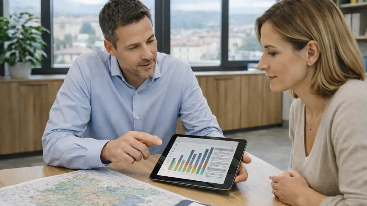 Пьемонт 2025: богатые и бедные коммуны по доходам Деловая сцена в Пьемонте: люди обсуждают карту региона и таблицу расходов на планшете, нейтральный современный стиль, дневной свет