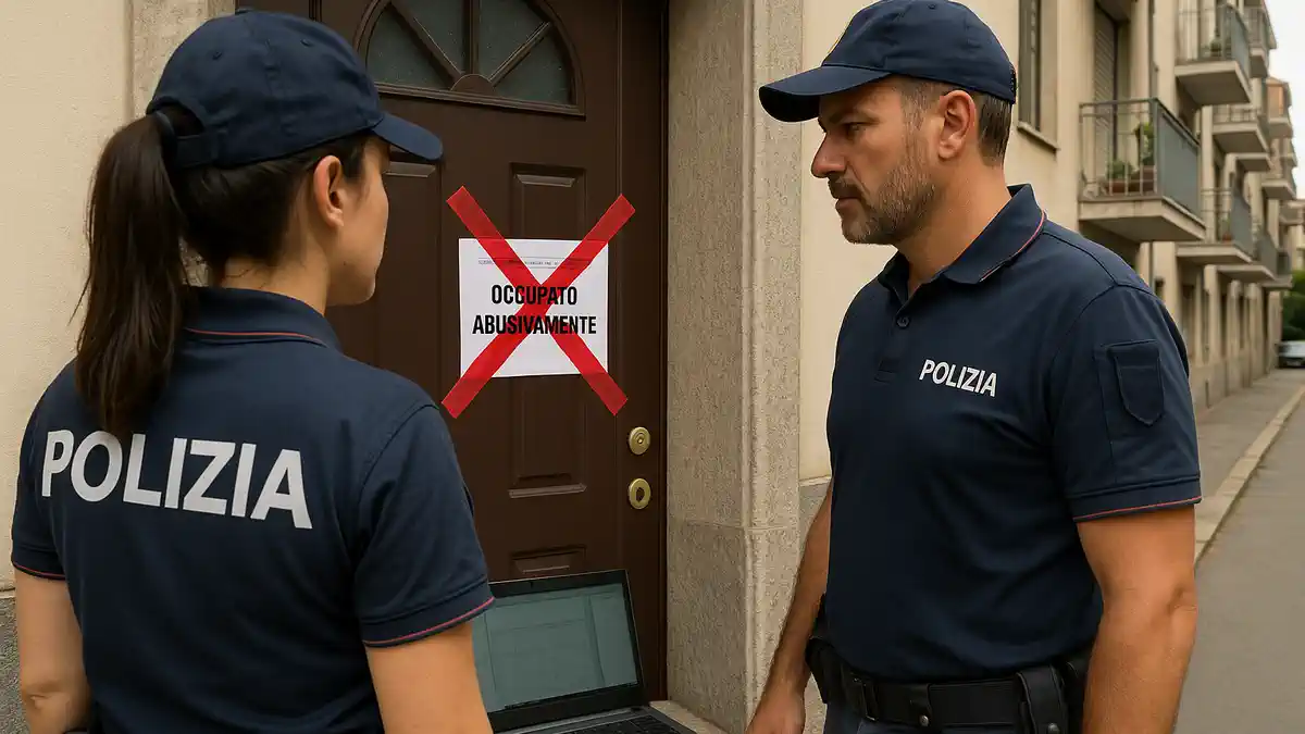 Окупасы в Италии: новый закон 634-bis и реальные наказания Жилой дом в Италии с опечатанной дверью и полицейскими, символизирующими борьбу с окупасами и новый закон 634-bis Codice Penale