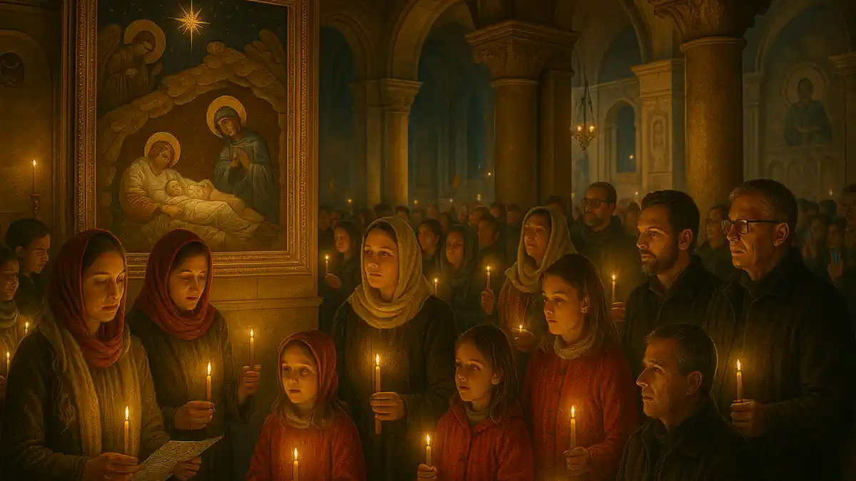 Православная рождественская служба в Италии: люди со свечами стоят в тёмном храме, в центре икона Рождества, на заднем плане видны элементы итальянской архитектуры.