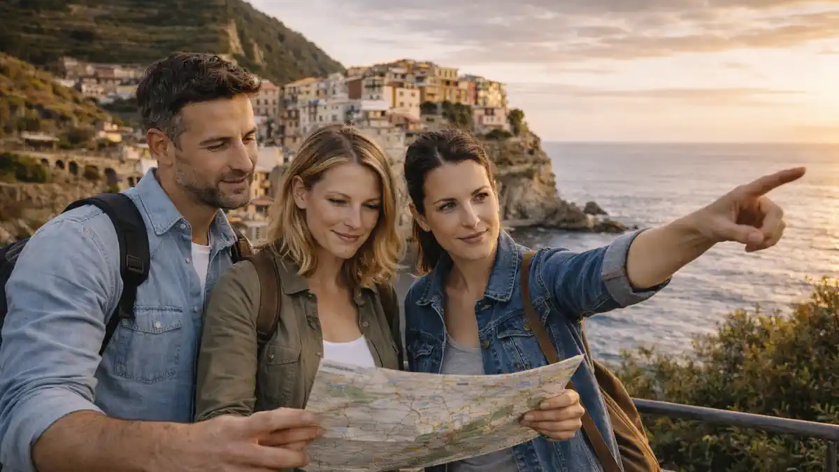 Лигурия, Чинкве-Терре: панорамная смотровая точка над морем, террасные виноградники и тропа вдоль скал, вдалеке цветные дома одной из деревень без читаемых вывесок. На переднем плане 3 путешественника 25-45 лет современные европейские славянские лица