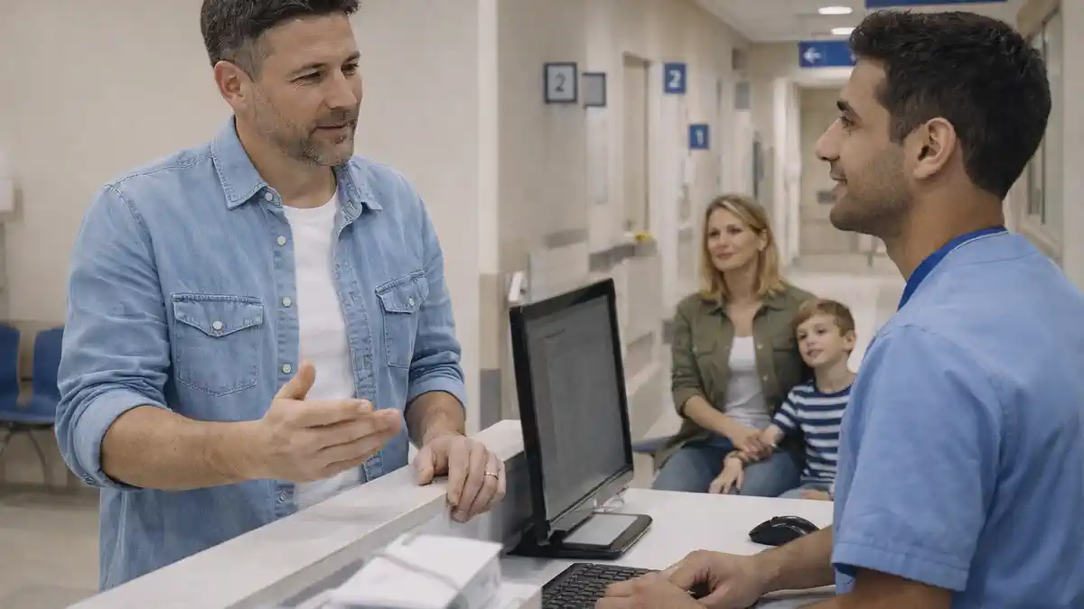 Иностранец без документов разговаривает с сотрудником регистратуры в итальянской поликлинике